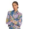 At first glance, the jacket commands attention with its timeless silhouette, featuring a tailored fit that accentuates the curves of the body while maintaining a sense of effortless sophistication. The high-quality denim fabric boasts a rich indigo hue, offering a nod to classic Americana style, yet it is the meticulously embroidered pastel roses that truly elevate this piece to a work of art. Delicately stitched onto the jacket’s surface, the roses cascade in a symphony of soft pinks, blushes, and creams, imbuing the garment with a romantic allure that is both captivating and whimsical.