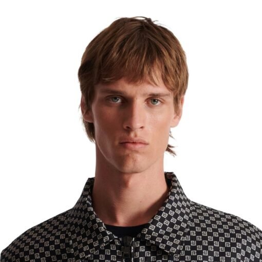 At first glance, the jacket’s exterior flaunts the unmistakable Balmain monogram pattern, meticulously woven into the fabric, a testament to the brand’s legacy of opulence. The monogram, meticulously stitched with precision, exudes an aura of exclusivity and prestige, instantly recognizable to fashion connoisseurs worldwide.