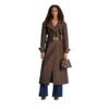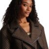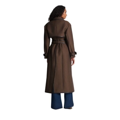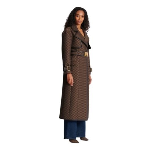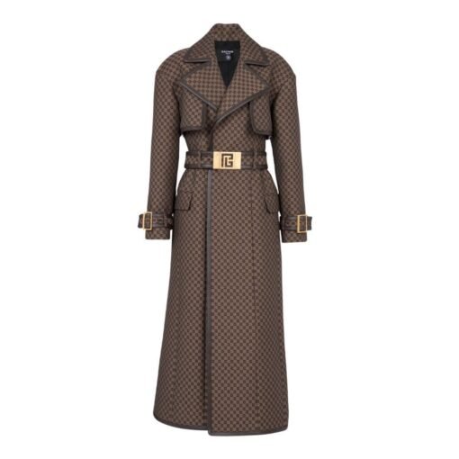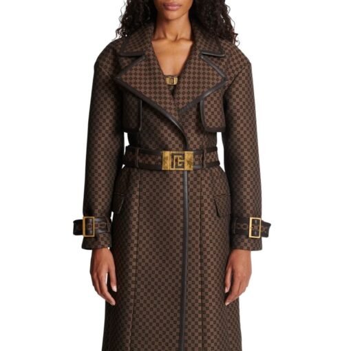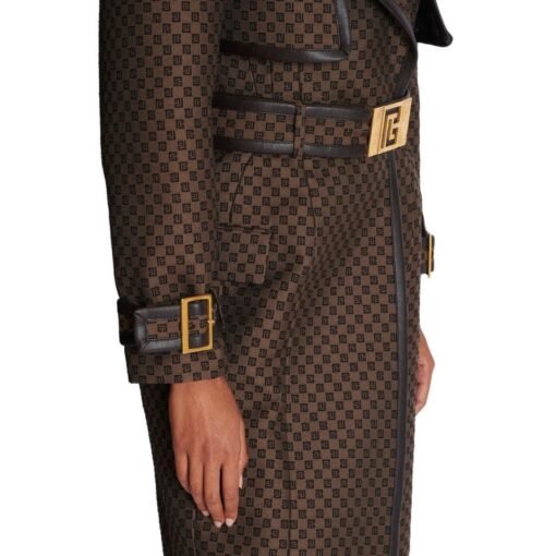 Constructed from high-quality fabric, the trench coat ensures a structured yet comfortable fit. The jacquard material not only highlights the intricate monogram but also provides a rich texture and depth, elevating the overall aesthetic. The coat’s design adheres to the timeless trench silhouette, characterized by its double-breasted front, wide lapels, and a belted waist, which accentuates the wearer’s figure while allowing for versatile styling options.