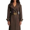 The coat is adorned with gold-tone hardware, including the distinctive Balmain embossed buttons that add a touch of opulence. The epaulettes on the shoulders, a hallmark of traditional trench coats, enhance the structured appearance and contribute to its classic military-inspired look. Additional details, such as the belted cuffs and the storm flap at the back, underscore the brand’s commitment to blending functional elements with high fashion.