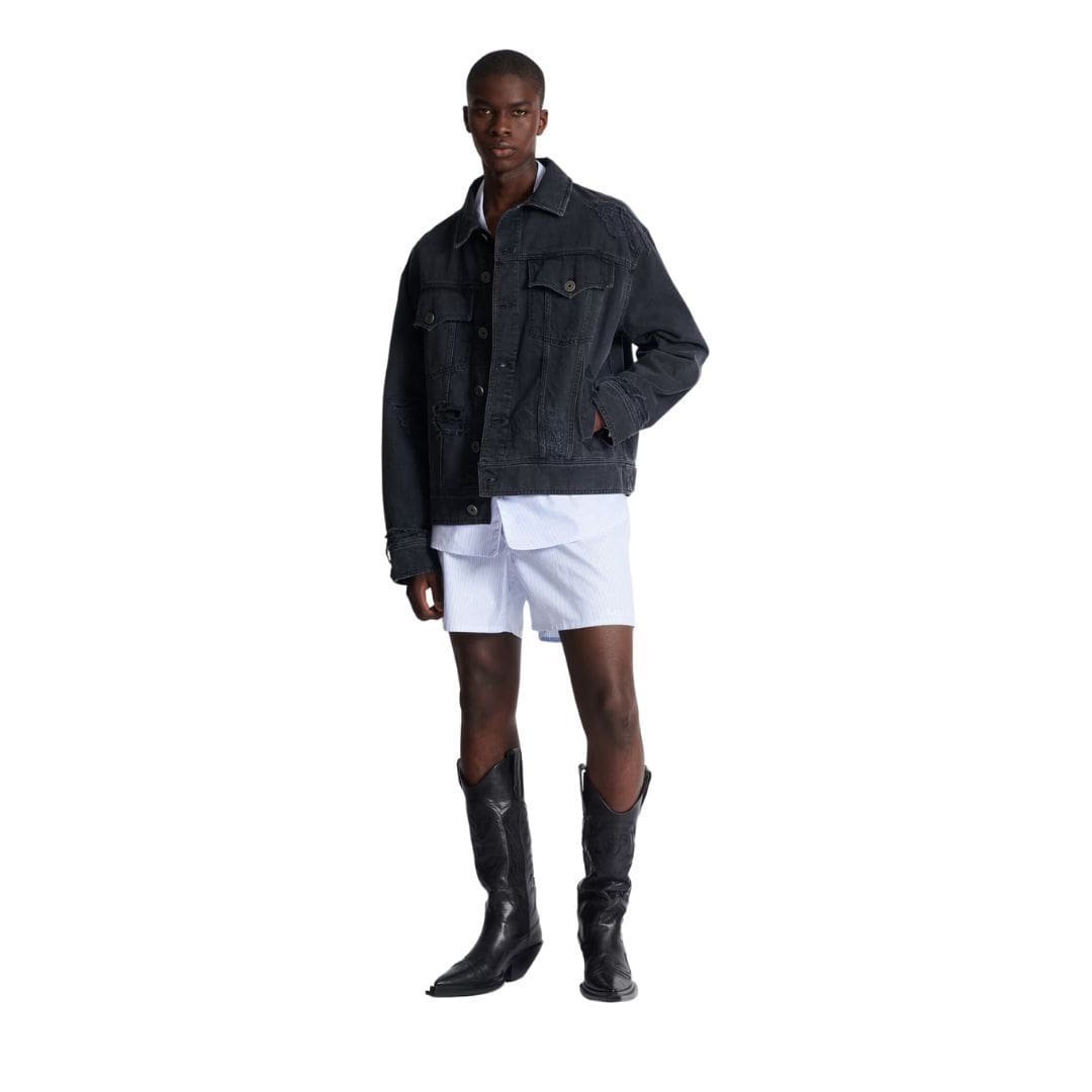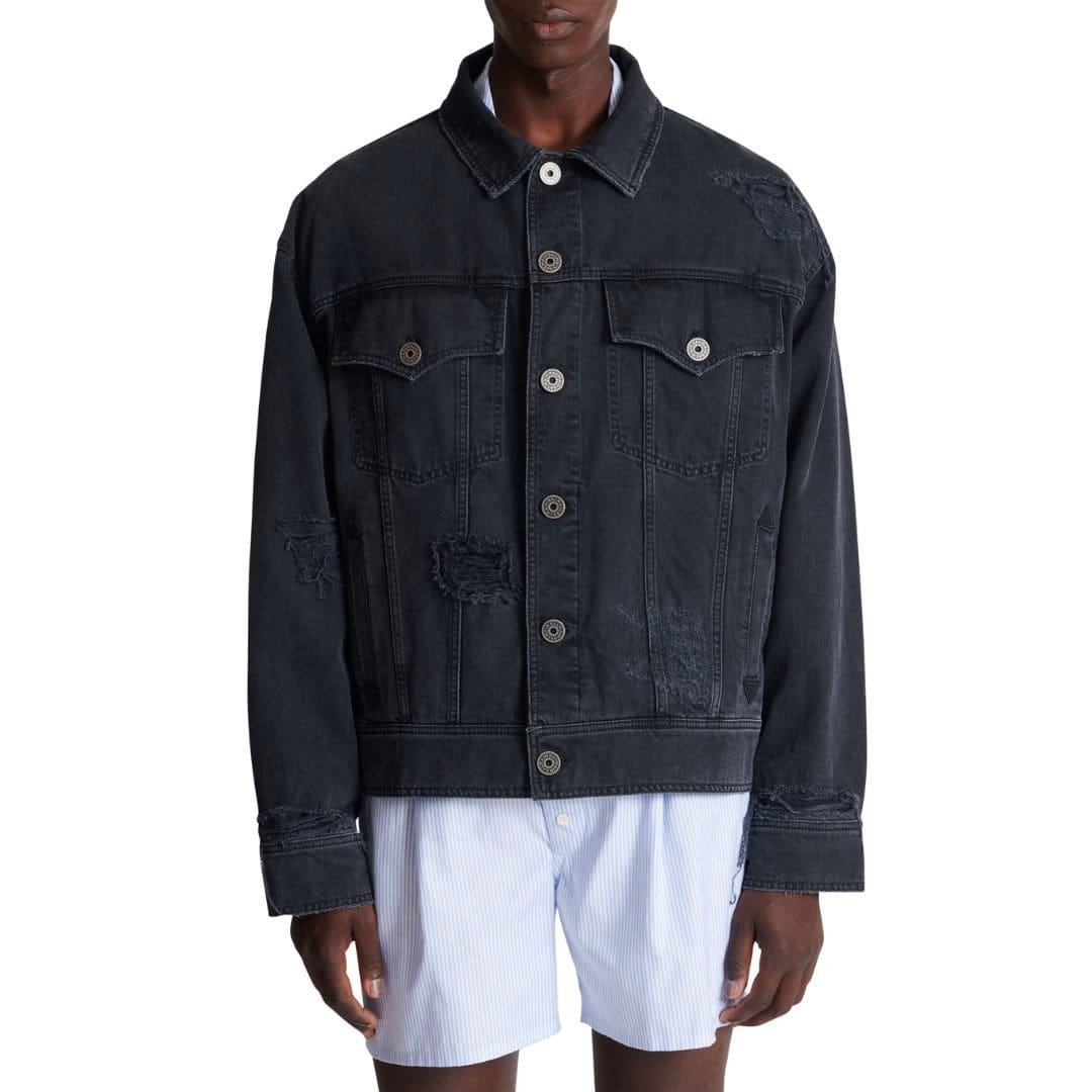At first glance, the jacket exudes an air of effortless coolness, with its distressed finish and strategically placed fading that create a worn-in, vintage aesthetic. The faded wash, meticulously crafted rips, and frayed edges evoke a sense of authenticity and lived-in charm, giving the impression of a well-loved garment with a storied history.