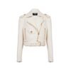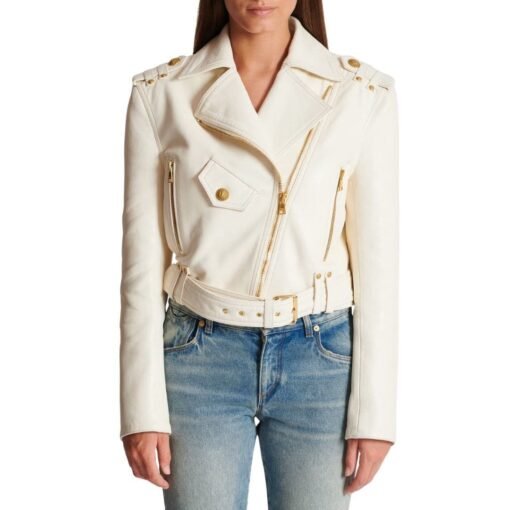 The hallmark of this biker jacket lies in its exquisite construction and thoughtful design elements. Bold silver-tone hardware, including asymmetrical zip closures and stud embellishments, adorns the jacket, lending it an unmistakable edge. The robust zippers not only serve as functional elements but also add a touch of industrial-inspired chic to the garment.