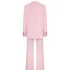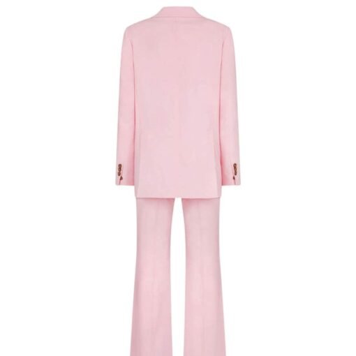The matching trousers continue the suit’s streamlined aesthetic, tailored to sit slightly lower on the waist with a flat front and a slim, tapered leg. This design ensures a modern fit that complements the jacket perfectly. The trousers feature practical elements such as side pockets, back welt pockets, and belt loops, making them as functional as they are fashionable.