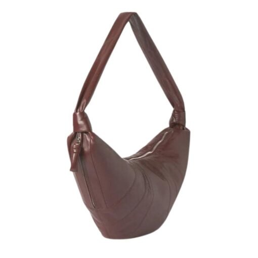 La Garconne Lemaire Large Croissant Bag is crafted from roasted pecan nappa leather in the large size. It features knot detailing at the shoulder strap with a covered tassel zipper pull and silver-tone metal hardware at the zip-top closure. Inside, there is a single pocket, and the bag is fully lined in beige cotton canvas.