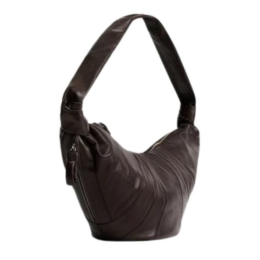 La Garconne Lemaire Medium Croissant Bag is crafted from medium dark tobacco leather. It features a side-knotted strap and a tassel zip-top pull, accented with silver-tone metal hardware at the zip-top closure. Inside, there is a single pocket, and the bag is lined with cotton.