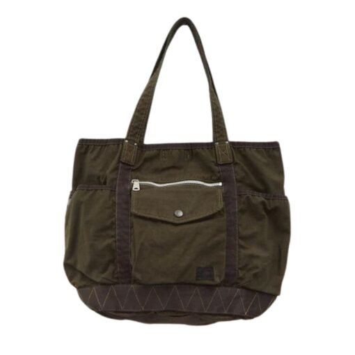 La Garconne Porter – Yoshida & Co Crag Tote Bag is crafted from cotton with a technical finish and features an exterior zipper pocket, a single press button patch pocket, and two slip pockets. It includes detailed stitching, top handles, silver-tone hardware, interior slip pockets, and an open top with a press button closure. The bag is finished with a nylon lining.