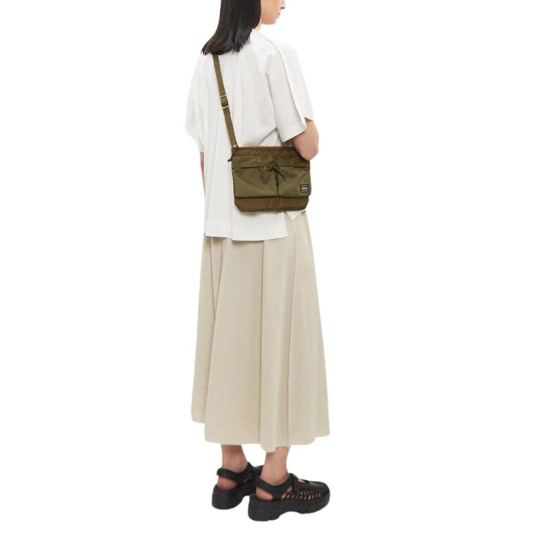 La Garconne Porter – Yoshida & Co Force Shoulder Bag is crafted from technical nylon and features two exterior zipper pockets. It includes an adjustable shoulder strap, an internal removable pouch, metal hardware, and a top zipper closure. The interior is finished with a bright orange nylon lining.