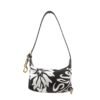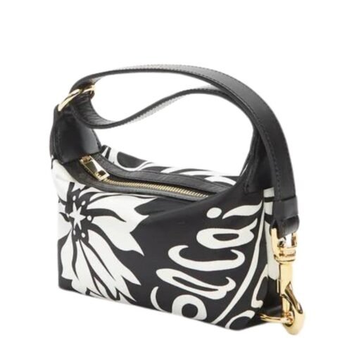 La Garconne Sacai Small Pochette — Black features a clasp and gold-tone metal hardware, adorned in a floral-printed taffeta fabric. It includes a top zip closure and an adjustable leather handle, allowing it to be worn as a shoulder bag. The bag comes fully lined in cotton twill.