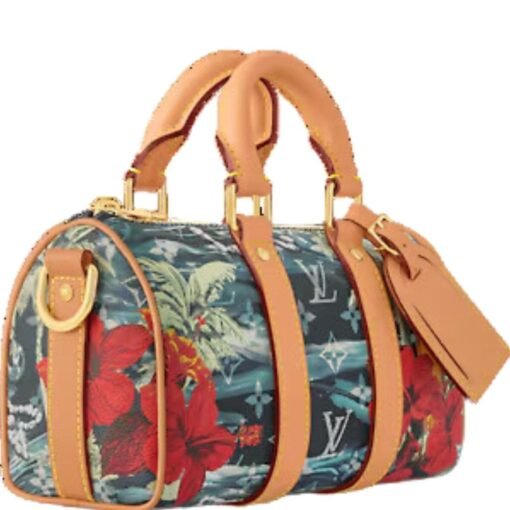 Introducing the LOUIS VUITTON KEEPALL BANDOULIERE 25, a compact version of Louis Vuitton’s iconic Keepall travel bag, redefined with Pharrell Williams’ Monogram Surfin’ canvas. This exquisite city bag features a detailed, summery print that artfully combines vintage-style tropical motifs, lending it a unique and timeless appeal.