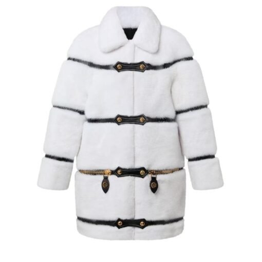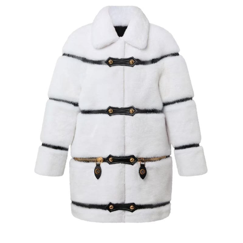 Crafted from plush mink, this sumptuous coat boasts a velvety-soft texture that exudes opulence. Strips of leather are expertly woven throughout the fabric, creating a sleek and sophisticated play of textures. The front of the coat features removable tabs adorned with golden Clous buttons, reminiscent of the intricate detailing found on Louis Vuitton’s iconic travel trunks. These luxurious accents elevate the coat’s overall design, adding a touch of glamour to its pristine white hue.