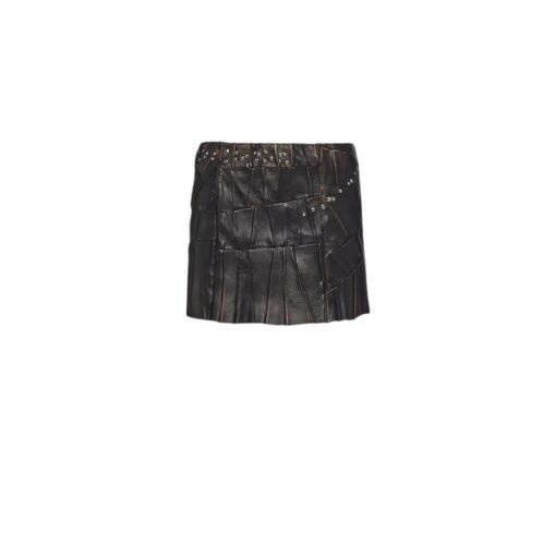 What sets this skirt apart is its subtle yet striking embellishments. Adorned with meticulously placed studs, the garment exudes a sense of rebellious charm, juxtaposing the classic silhouette with a touch of rock ‘n’ roll attitude. The studs not only add a tactile dimension to the piece but also catch the light, creating a mesmerizing play of shadows and highlights as the wearer moves.