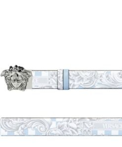 At the heart of the belt lies the emblematic Greca motif, an emblem synonymous with Versace’s rich heritage and distinctive aesthetic. The Greca pattern, inspired by ancient Greek art and architecture, adorns the entirety of the belt, exuding sophistication and cultural significance. Each intricately embossed line of the Greca motif speaks to the brand’s commitment to craftsmanship and excellence.