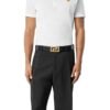 Embellishing the belt is the iconic Versace logo, discreetly placed on the buckle, serving as a symbol of prestige and refinement. The buckle itself is meticulously crafted, featuring a sleek, polished finish that further accentuates the belt’s luxurious appeal.