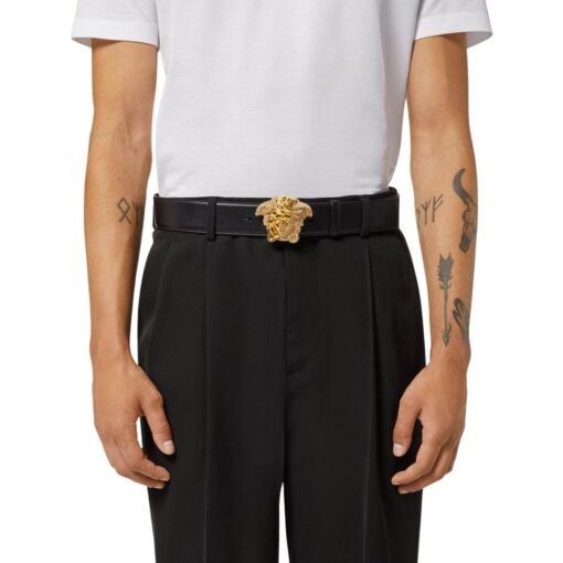 Measuring 4 cm in width, the belt strikes the perfect balance between subtlety and impact, allowing it to be effortlessly paired with a range of ensembles. Whether cinched around the waist of a tailored suit or worn casually with denim, it adds a touch of Versace’s signature glamour to any look.