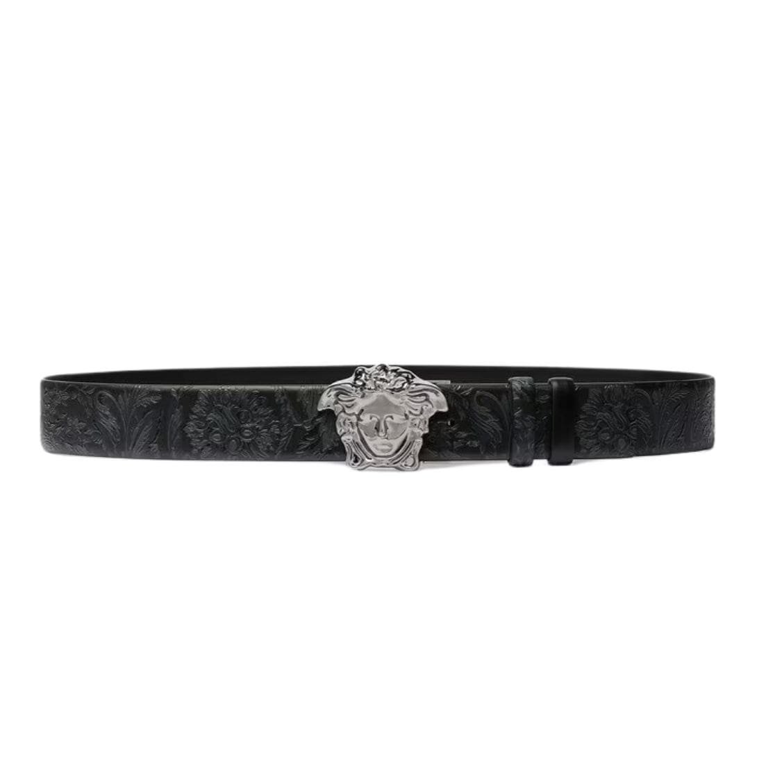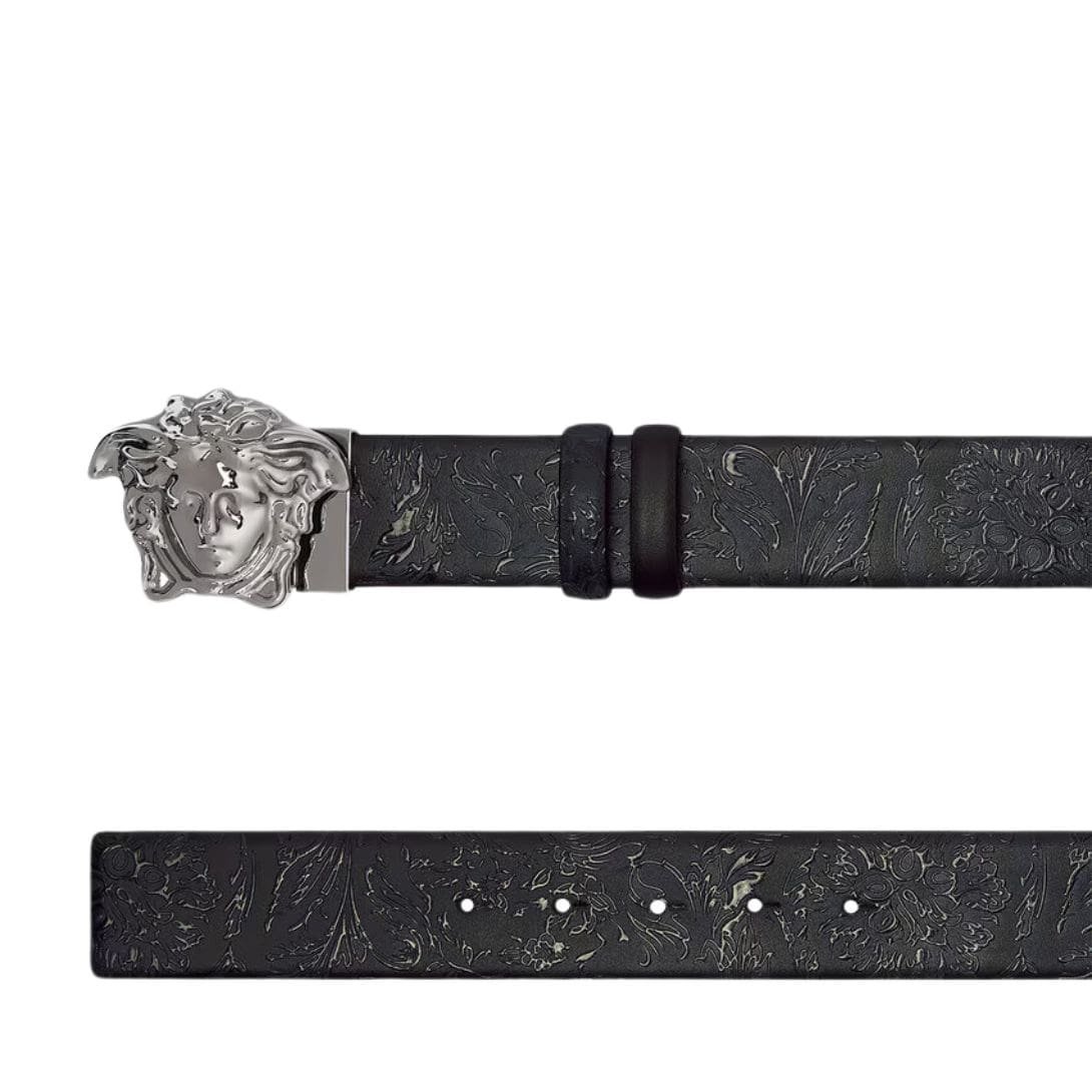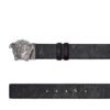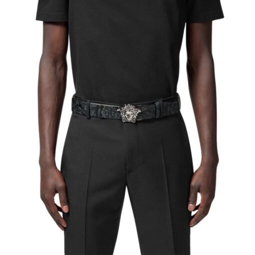 At the heart of the design lies the iconic Versace emblem, the Medusa head, which serves as the focal point of the belt buckle. Symbolizing power, allure, and mystique, the Medusa motif is intricately sculpted, exuding an air of timeless elegance. The gold-tone finish of the buckle adds a touch of extravagance, enhancing the belt’s overall allure.