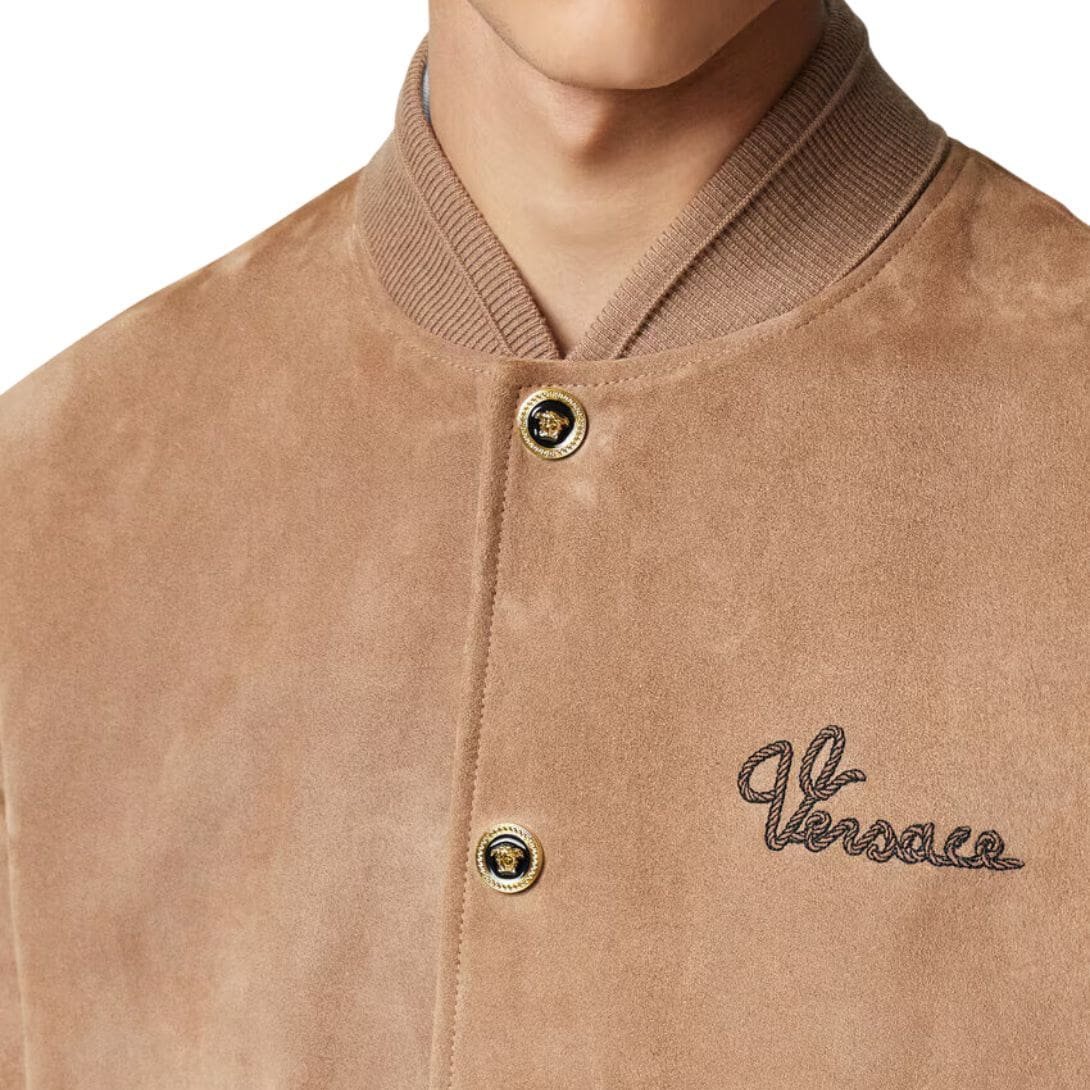 Crafted from the finest materials, the bomber jacket boasts impeccable construction and superior quality, characteristic of Versace’s esteemed craftsmanship. The exterior showcases a lustrous finish, adding a touch of glamour to the ensemble, while ensuring durability and resilience against the elements.